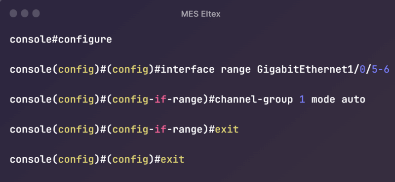 сonsole(config)#(config-if-range)#channel-group 1 mode auto