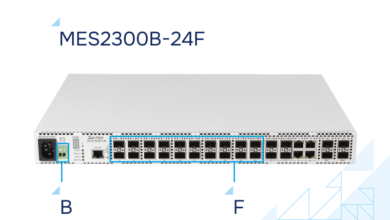 «F» (fiber) — указывает, что downlink-порты выполнены в форм-факторе SFP/SFP+ и предназначены для подключения оптических/медных SFP-модулей.