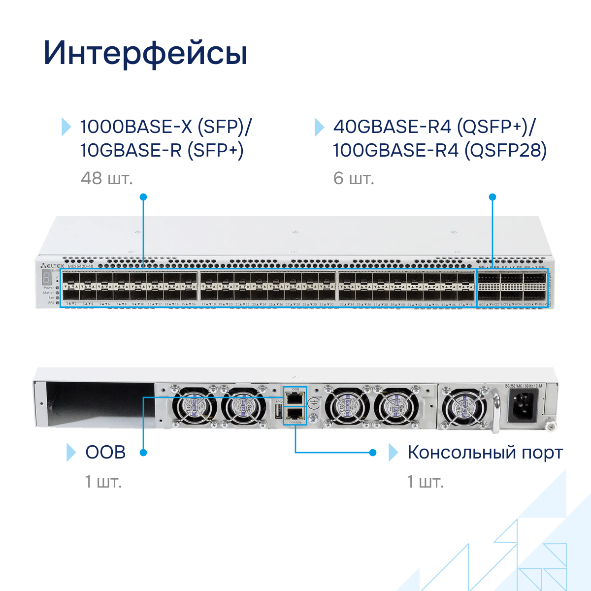 MES5400-48 мощный коммутатор агрегации Российского производства. MES5400-48 оснащен мощными процессором и чипом управления, поэтому его часто используют в операторских сетях в качестве устройств агрегации и в центрах обработки данных (ЦОД) в качестве Top-of-Rack или End-of-Row коммутаторов.