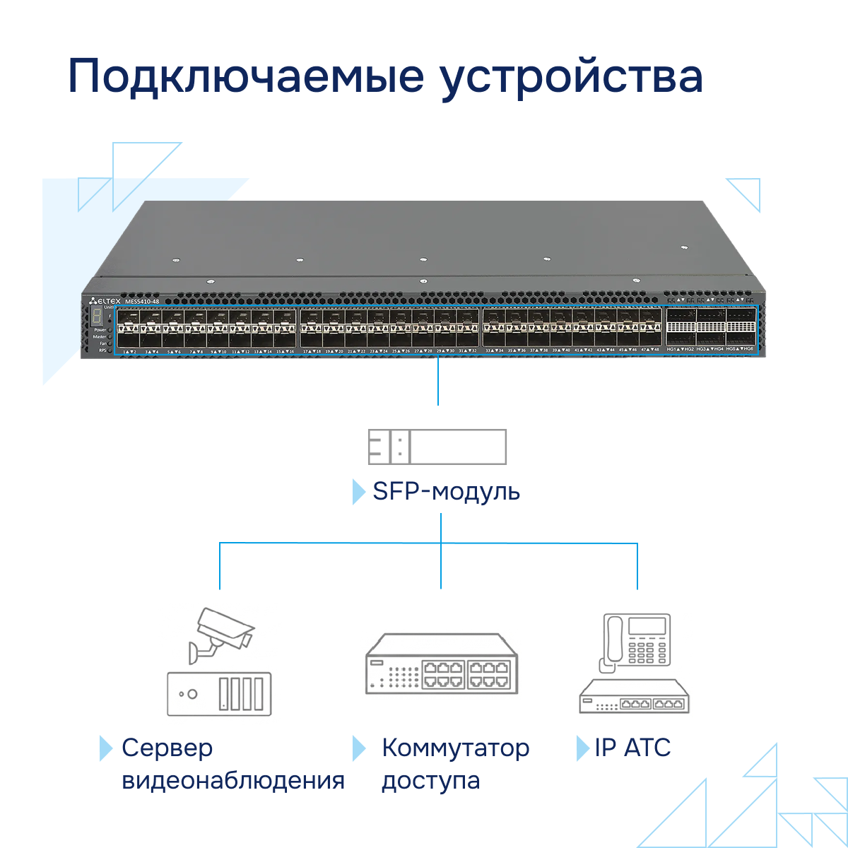 MES5410-48 мощный коммутатор агрегации Российского производства. MES5410-48 оснащен мощными процессором и чипом управления, поэтому его часто используют в операторских сетях в качестве устройств агрегации и в центрах обработки данных (ЦОД) в качестве Top-of-Rack или End-of-Row коммутаторов.