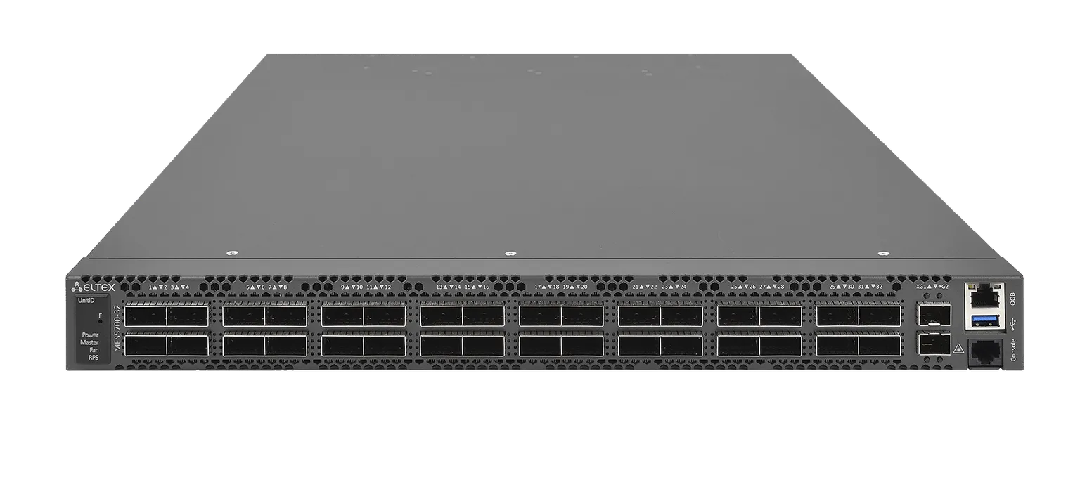 Коммутатор MES5700-32 — это высокопроизводительное устройство, оснащенное интерфейсами 100GBASE-R4 и 400GBASE-DR4 и предназначенное для использования в сетях центров обработки данных (ЦОД) в качестве Super-Spine, а также Top-of-Rack или End-of-Row коммутатора