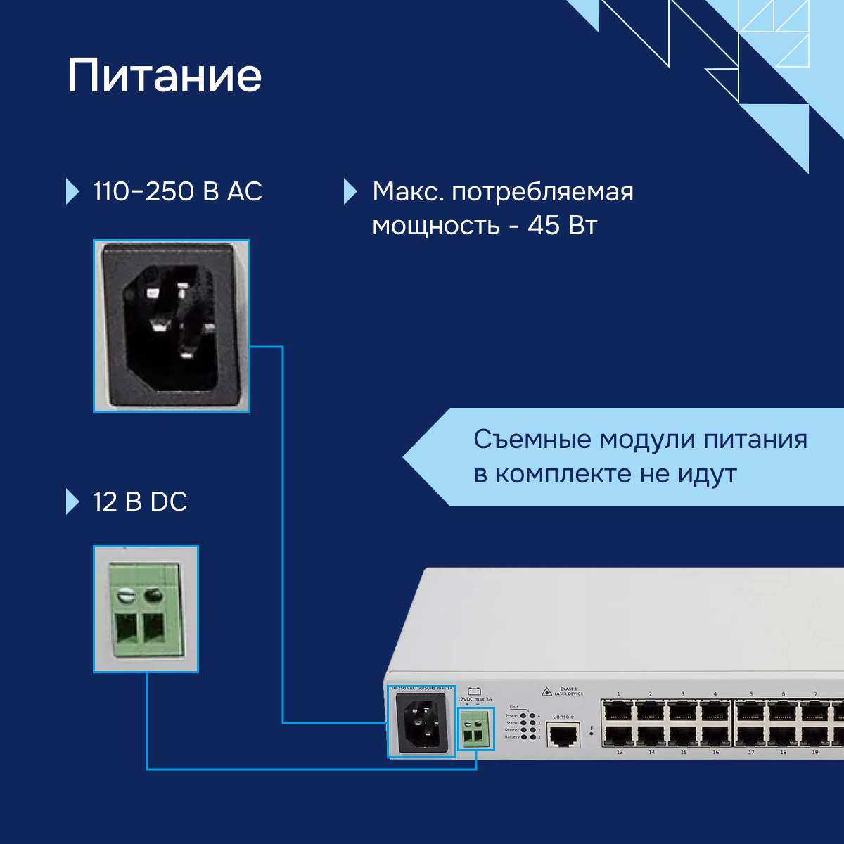- Тип питания - 110-250 В AC, 50-60 Гц; 12 В DC