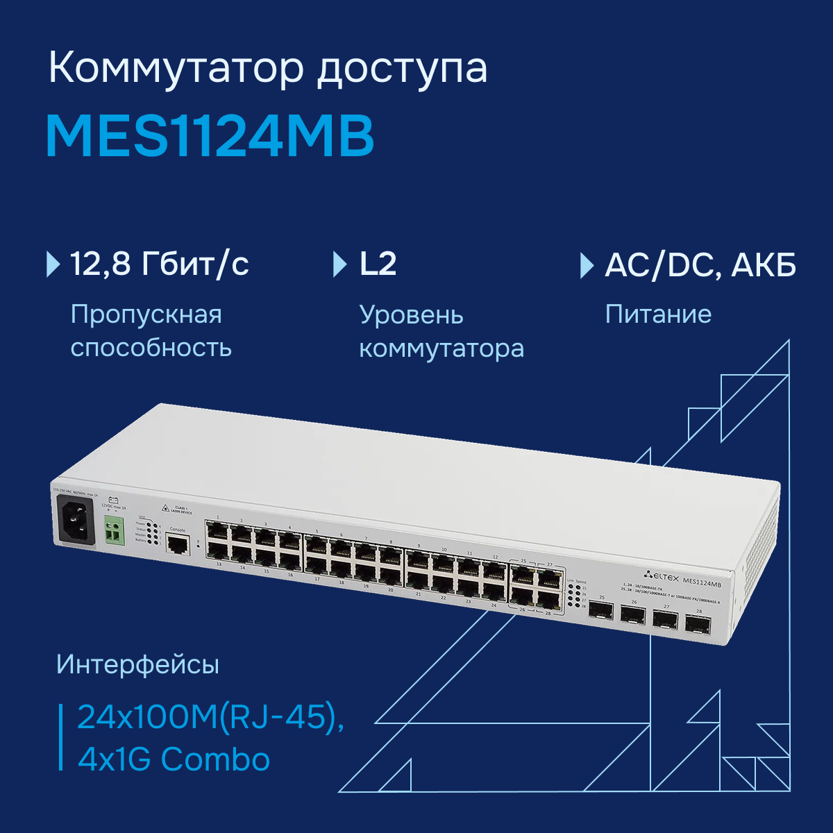 Управляемый коммутатор MES1124MB с возможностью подключения аккумуляторной батареи. Коммутатор подключает конечных пользователей к сети крупных предприятий, предприятий малого и среднего бизнеса и к сетям операторов связи с помощью интерфейсов Fast и Gigabit Ethernet.