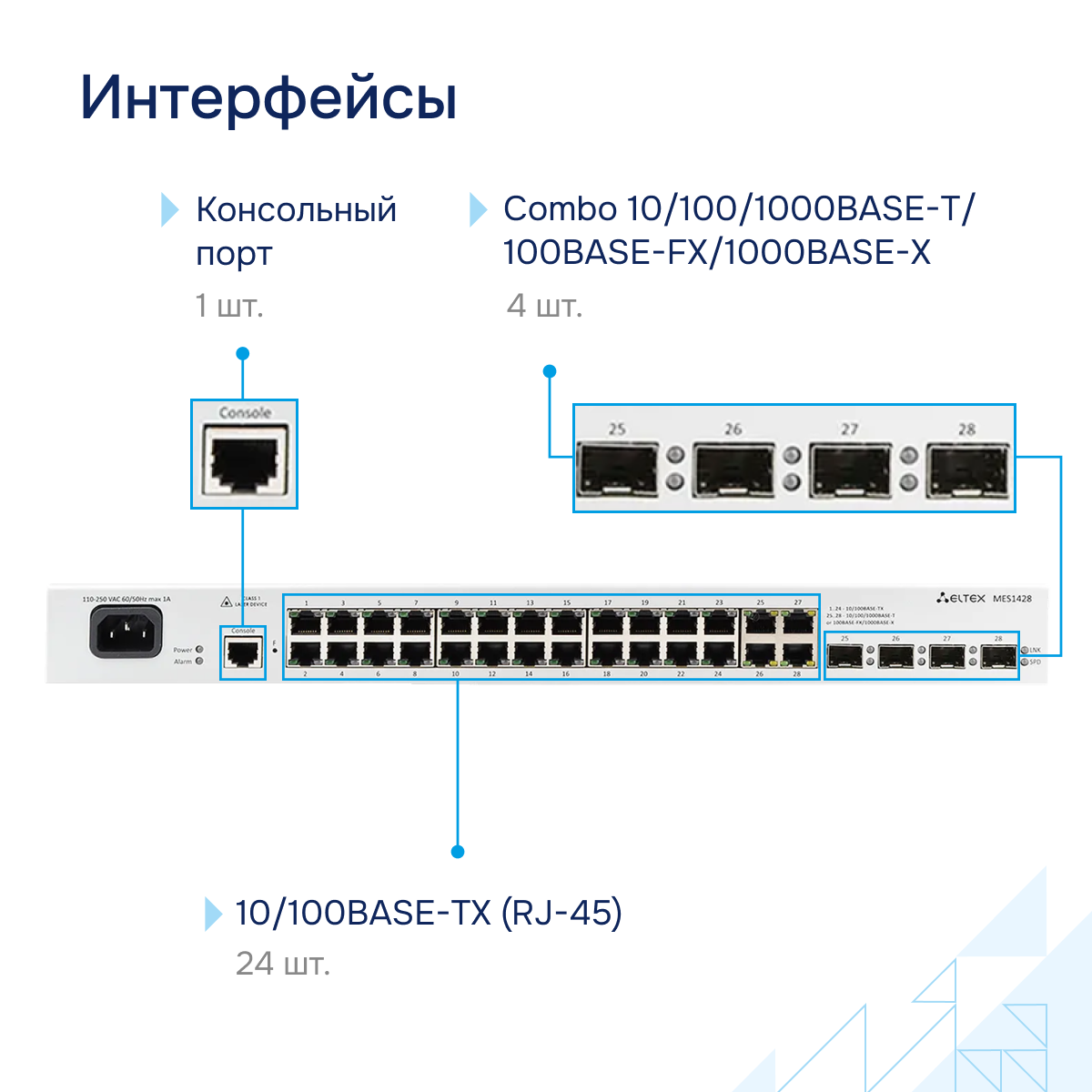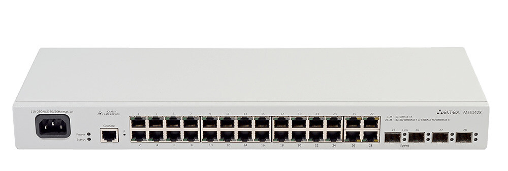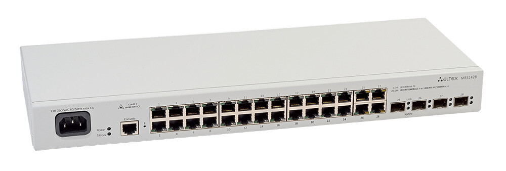 Коммутатор доступа 100M MES1428 от Eltex – идеальное решение для предприятий малого и среднего бизнеса. Устройство имеет необходимые функции для создания надежного соединения и бесперебойной работы сети. MES1428 гарантирует высокоскоростное подключение, что позволяет передавать данные со скоростью до 100 Мбит/с.