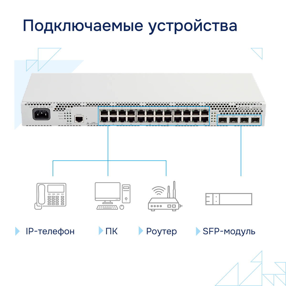 Коммутатор MES2324 подключает конечных пользователей к сети крупных предприятий, предприятий малого и среднего бизнеса и к сетям операторов связи с помощью интерфейсов 1G/10G. Пропускная способность коммутатора 128 гигабит в секунду гарантирует высокую пропускную способность данных и эффективное управление сетевым трафиком.