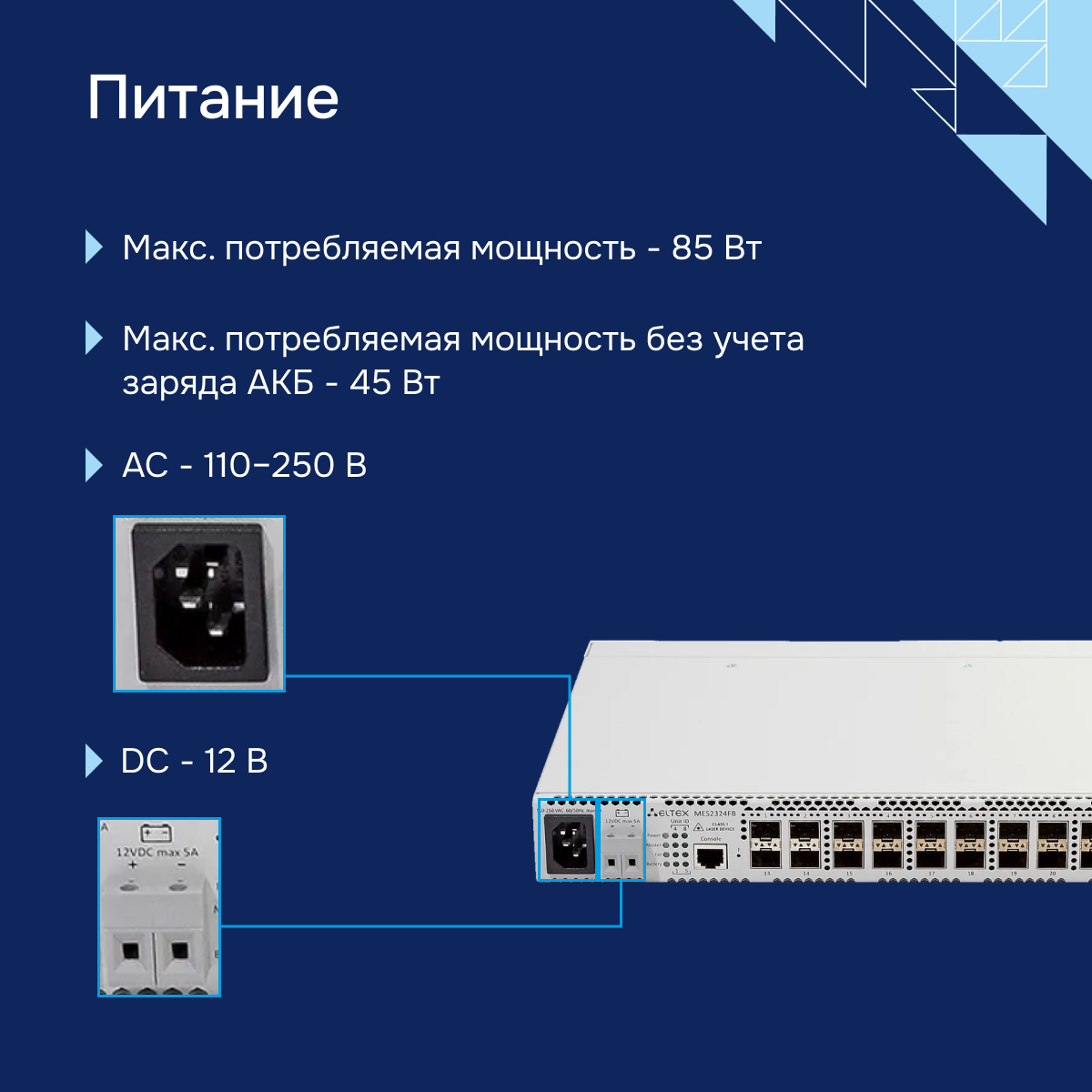- Тип питания - AC, возможность подключения АКБ