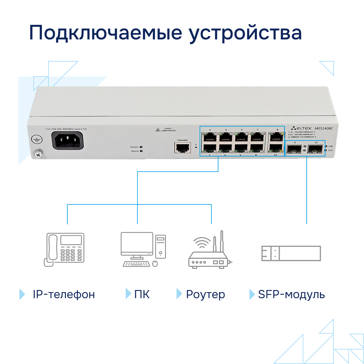 Коммутатор MES2408C подключает конечных пользователей к сетям крупных предприятий, предприятий малого и среднего бизнеса, а также к сетям операторов связи. Он имеет неблокируемую коммутационную матрицу, с помощью которой способен обрабатывать данные на высокой скорости и в режиме реального времени без потери пакетов.