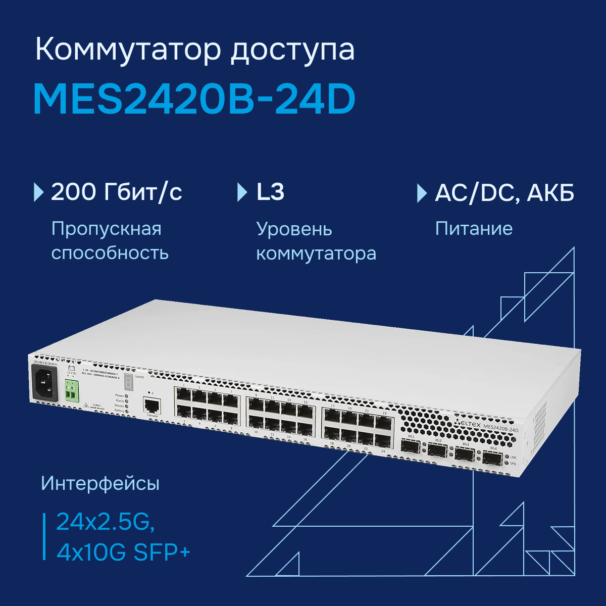 MES2420B-24D подключает конечных пользователей к сетям крупных предприятий, предприятий малого и среднего бизнеса, а также к сетям операторов связи с помощью интерфейсов 2.5G/10G. В данной модели присутствует способность подключения аккумуляторной батареи для обеспечения питанием в случае аварийного отключения.
