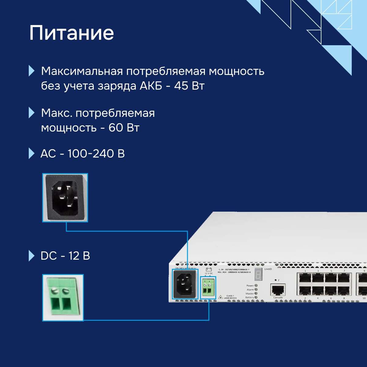 Коммутаторы MES2420B-24D имеют возможность подключения аккумуляторной батареи для обеспечения гарантированного питания в случае пропадания первичной сети 220 В, а блок питания позволяет заряжать АКБ при наличии питания 220 В. Система резервного питания позволяет следить за состоянием первичной сети и извещать о переходе с одного типа питания на другой.2. Крепления в 19" телекоммуникационную стойку;