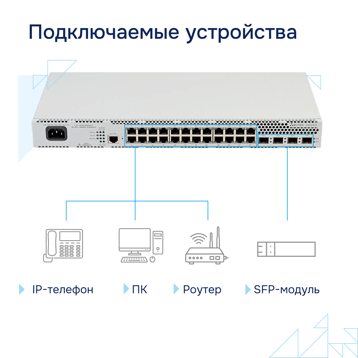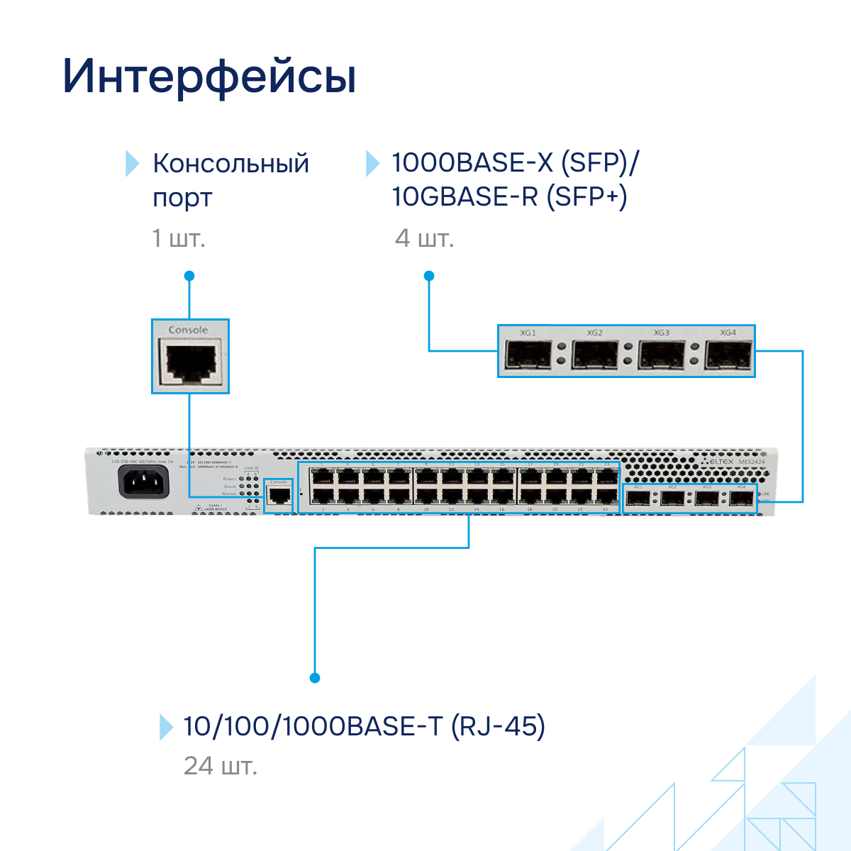 Управляемый L3 коммутатор осуществляет подключение конечных пользователей к сетям крупных предприятий, предприятий малого и среднего бизнеса, а также к сетям операторов связи с помощью интерфейсов 1G/10G.Аппаратная поддержка Dying Gasp для MES2424 AC