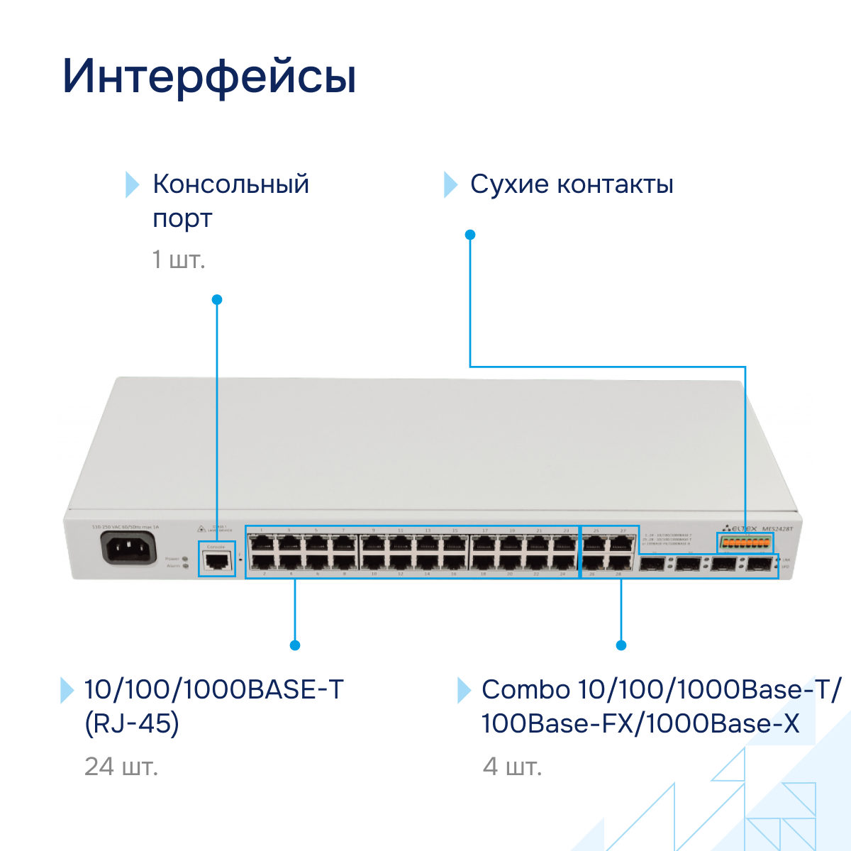 Управляемый коммутатор L2 подключает конечных пользователей к сети крупных предприятий, предприятий малого и среднего бизнеса и к сетям операторов связи с помощью интерфейсов Gigabit Ethernet.Особенность коммутатора - встроенные сухие контакты.