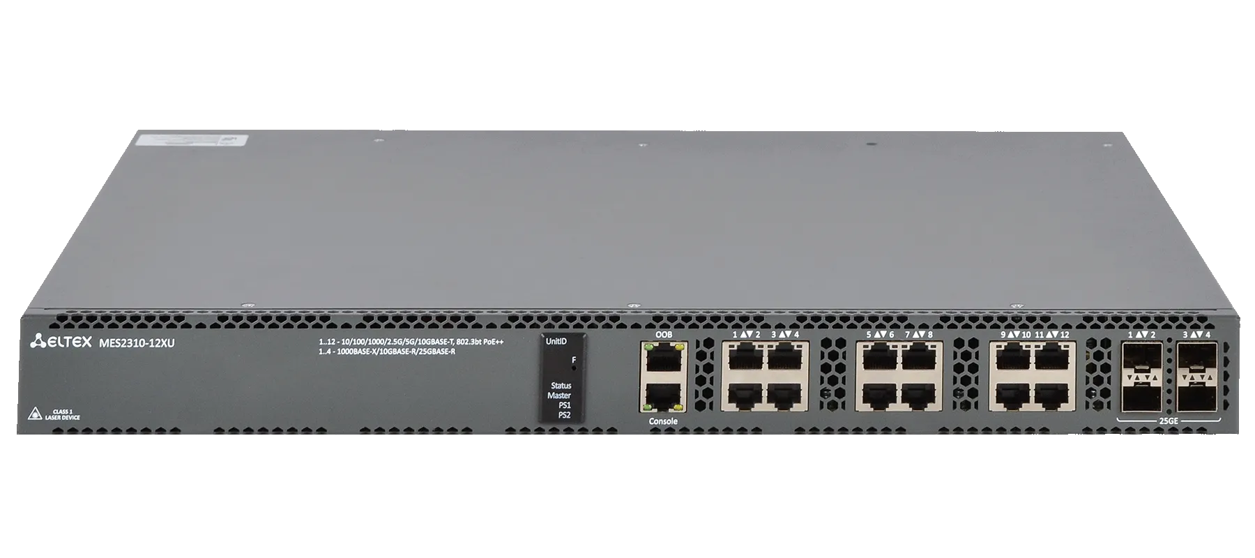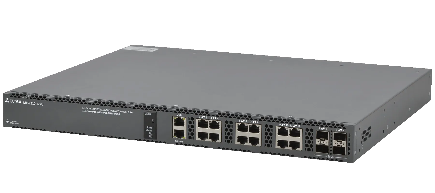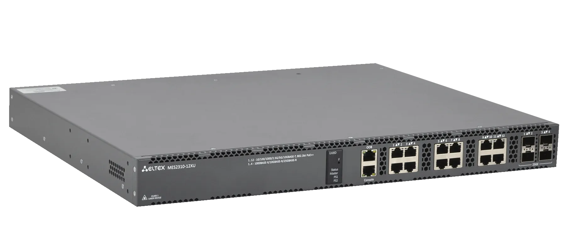 Коммутатор MES2310-12XU с поддержкой PoE++ осуществляет подключение конечных пользователей к сети крупных предприятий, предприятий малого и среднего бизнеса и к сетям операторов связи с помощью интерфейсов 25GBASE-R.