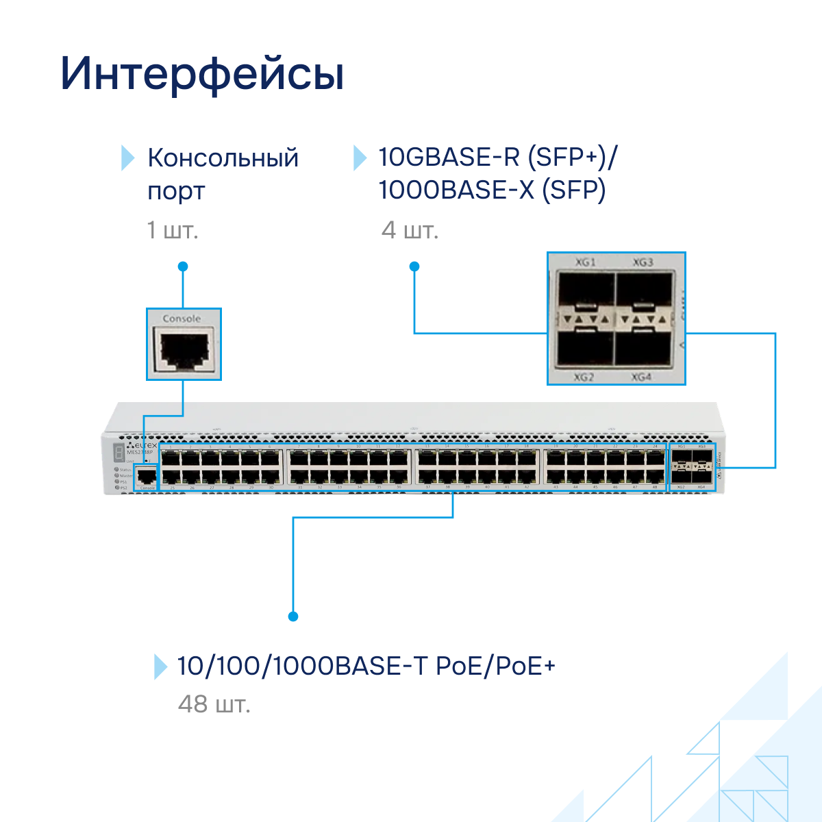 Коммутатор Eltex MES2348P Российского производства активно применяется для подключения конечных пользователей к сети крупных предприятий, предприятий малого и среднего бизнеса и к сетям операторов связи с помощью интерфейсов 1G/10G.