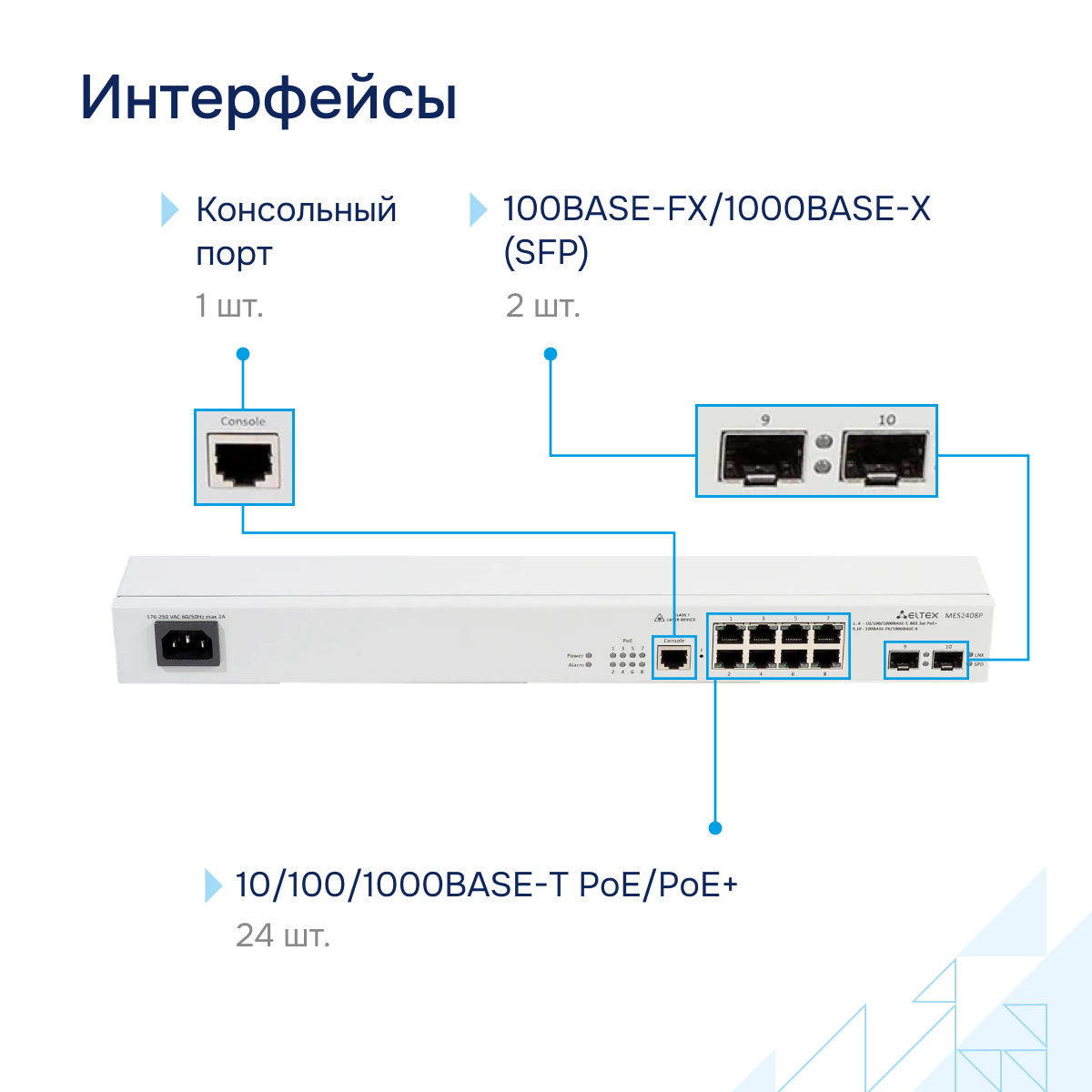 MES2408P имеет расширенные функции безопасности, которые обеспечивают защиту сетевых ресурсов от внешних угроз. L2-L4 ACL (Access Control Lists) настраивают правила доступа к сетевому трафику, блокируют нежелательные пакеты и гарантируют безопасность сети. Кроме того, функции IP Source Guard и Dynamic ARP Inspection, позволяют предотвратить атаки, связанные с подменой MAC-адресов и IP-адресов.