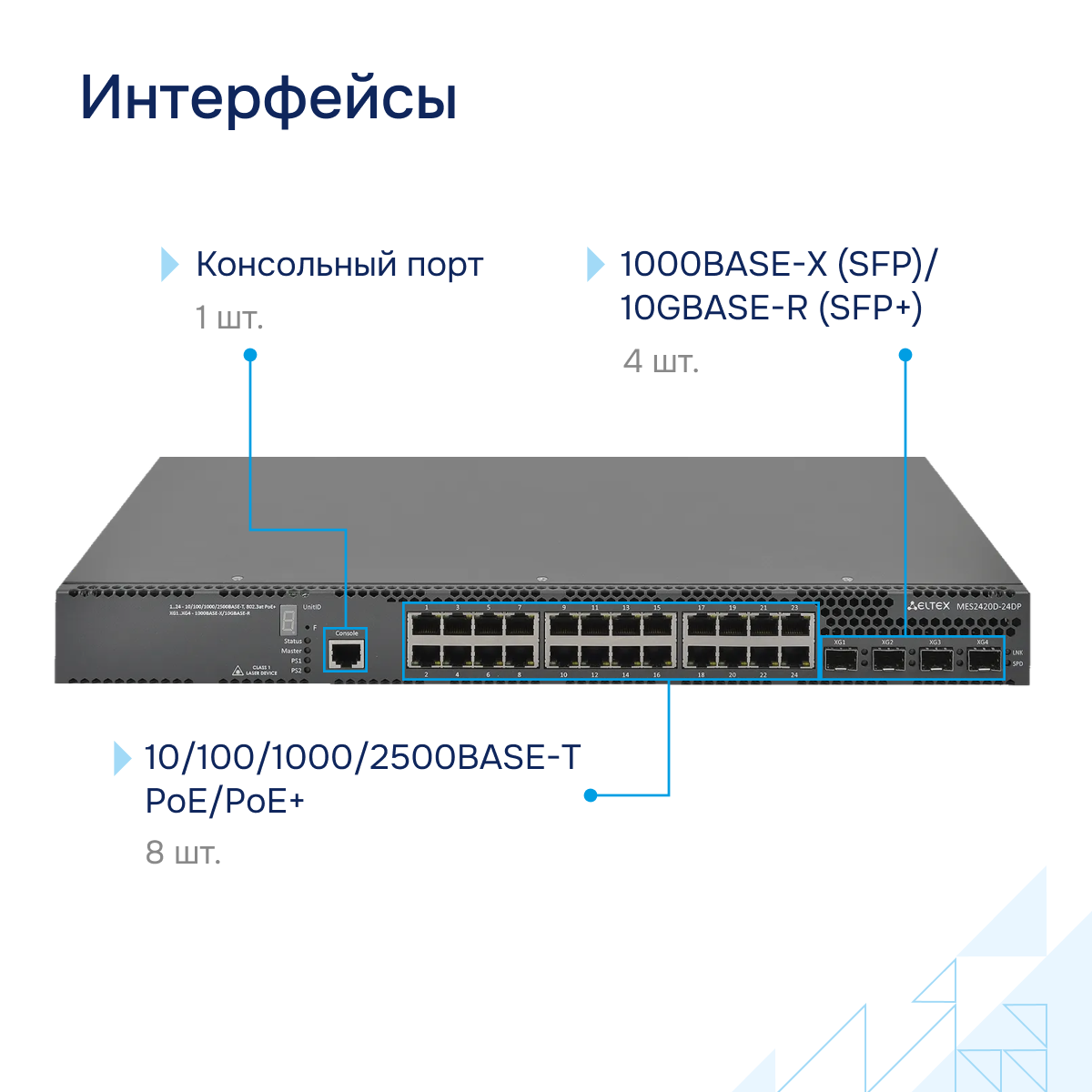 - Интерфейсы: 10/100/1000/2500BASE-T PoE/PoE+