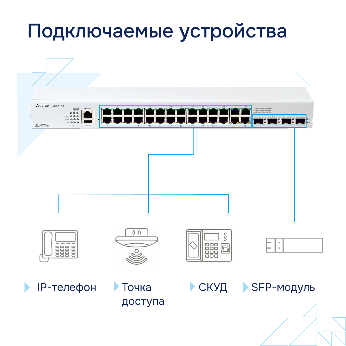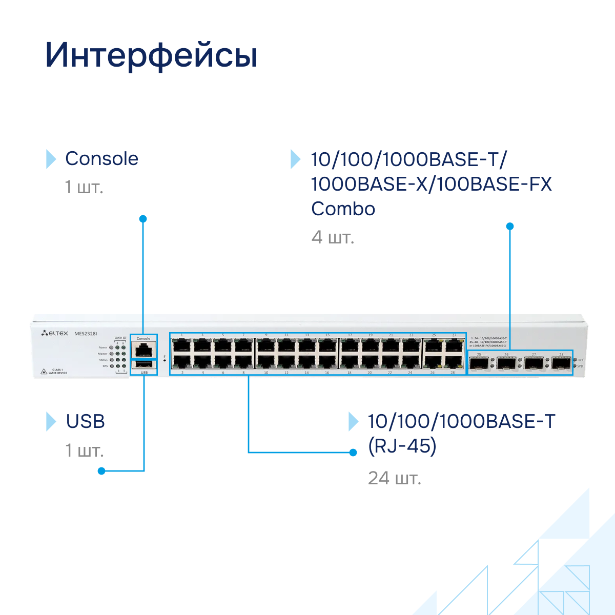 MES2328I - коммутатор уровня L3, что позволяет эффективно маршрутизировать трафик и создать оптимальную работу сети. Кроме того, он предоставляет расширенные функции безопасности, такие как L2-L4 ACL, IP Source Guard, Dynamic ARP Inspection, обеспечивая высокий уровень защиты сети от возможных угроз и атак.