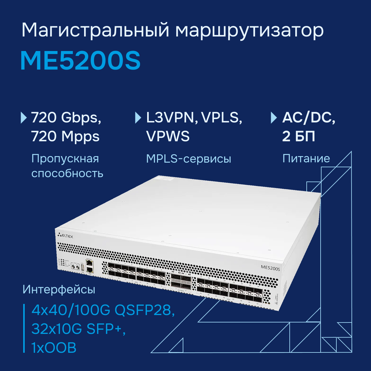 Маршрутизатор ядра ME5200S представляет собой многофункциональное устройство с высокой плотностью портов, разработанное специально для сетей операторов связи. Это решение предназначено для использования в роли агрегирующего маршрутизатора и маршрутизатора границы транспортной/MPLS-сети, обеспечивая надежную и эффективную передачу данных. Маршрутизатор ME5200S удобен для организации точек присутствия оператора (PoP), когда требуется предоставление услуг корпоративным клиентам с высокими требованиями к надежности и производительности.