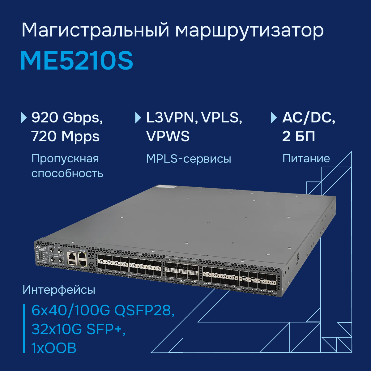 Маршрутизатор ядра ME5210S представляет собой многофункциональное устройство с высокой плотностью портов, разработанное специально для сетей операторов связи. Это решение предназначено для использования в роли агрегирующего маршрутизатора и маршрутизатора границы транспортной/MPLS-сети, обеспечивая надежную и эффективную передачу данных. Маршрутизатор ME5210S удобен для организации точек присутствия оператора (PoP), когда требуется предоставление услуг корпоративным клиентам с высокими требованиями к надежности и производительности.