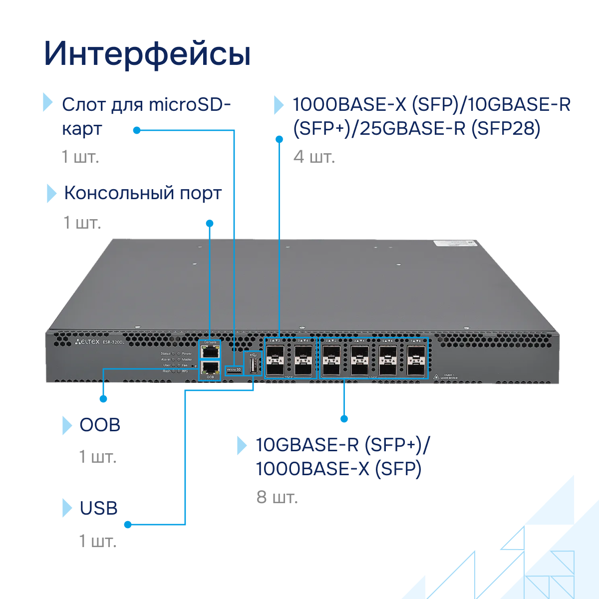 Устройство имеет 4 порта 1000BASE-X/10GBASE-R/25GBASE-R (LAN/WAN) и 8 портов 10GBASE-R SFP+/1000BASE-X SFP (LAN/WAN). Также присутствует порт OOB.